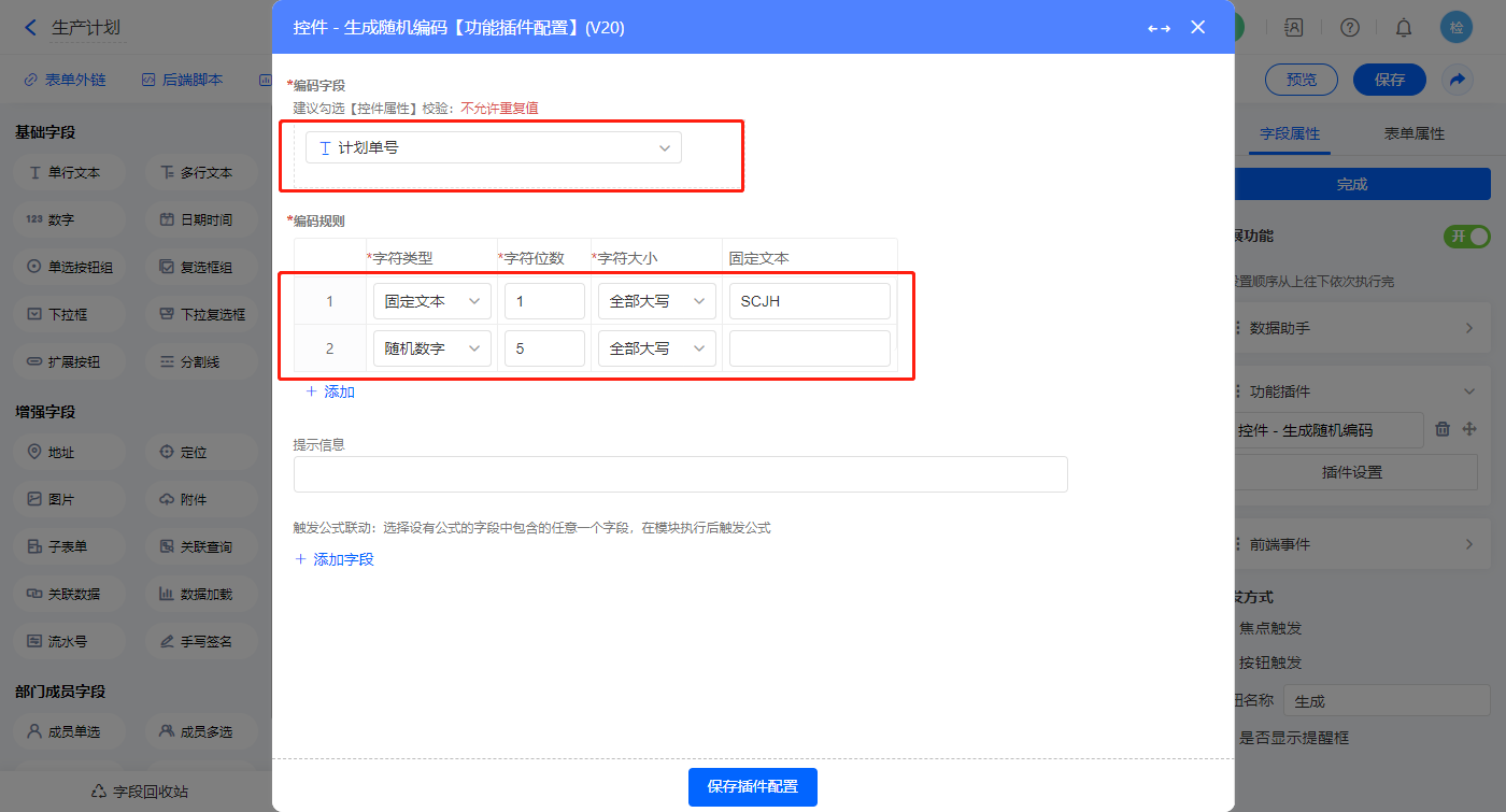 如图配置功能插件【控件-生成随机编码】,配置完保存;