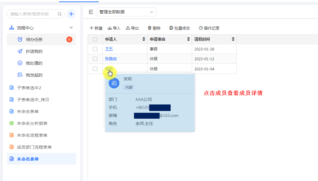 - 查看数据中成员详情时,字段值为空时该字段不展示。如设置展示邮箱字段,但成员的邮箱为空,则查看该成员详情时邮箱不展示。