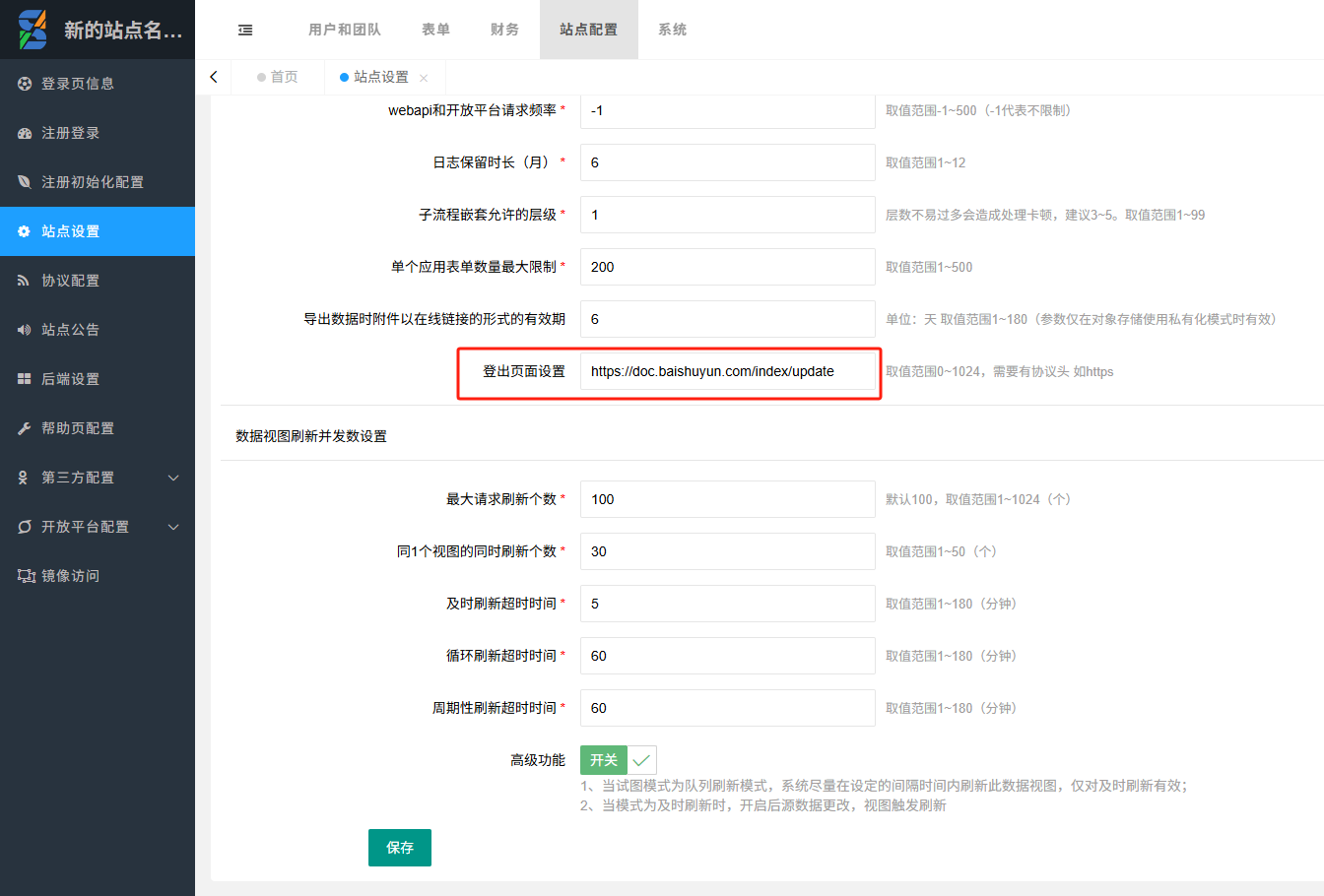 - 后台>站点设置,增加可以设置全站的默认退出指定链接。
