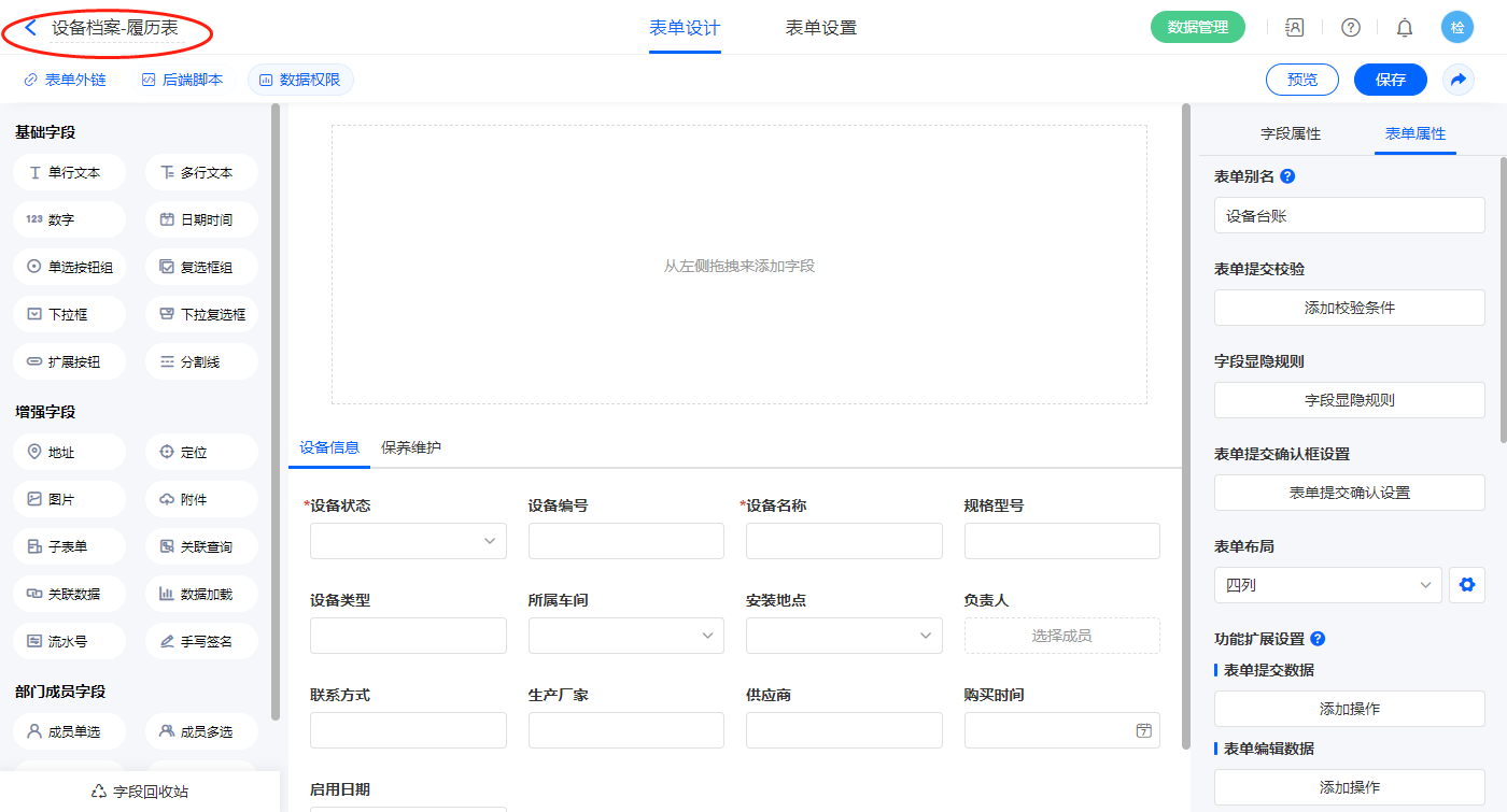 1)新建表单【设备档案-履历表】,字段设置如下: