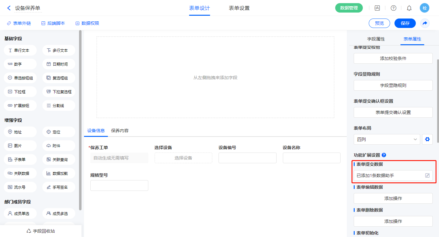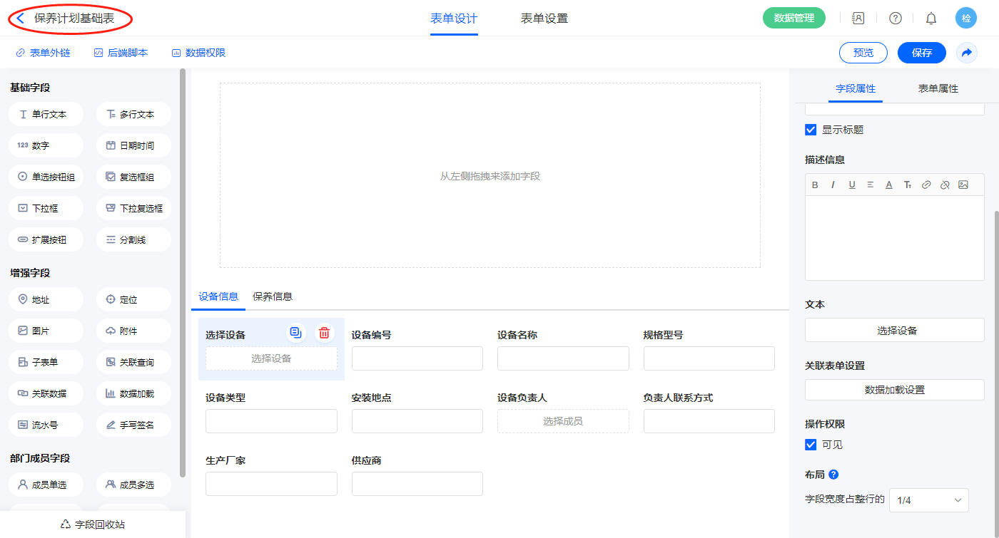• 2.3、表单【设备保养单】字段及表单属性设置
