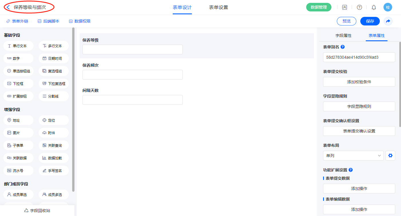 2.4、表单【保养计划基础表】字段及表单属性设置