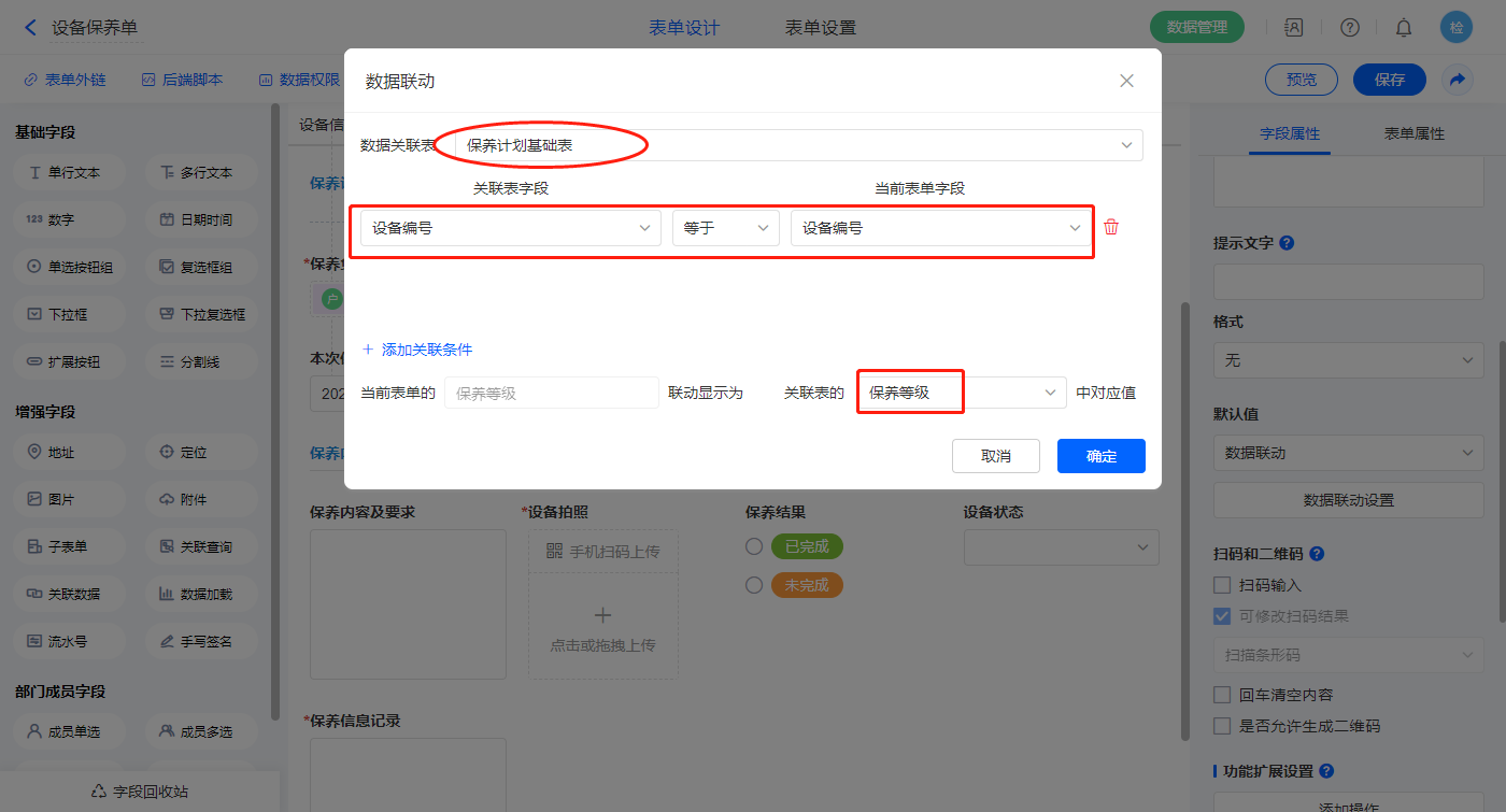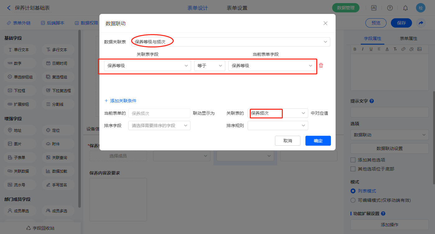 【保养频次】字段,设置默认值为数据联动,设置联动条件及联动字段;