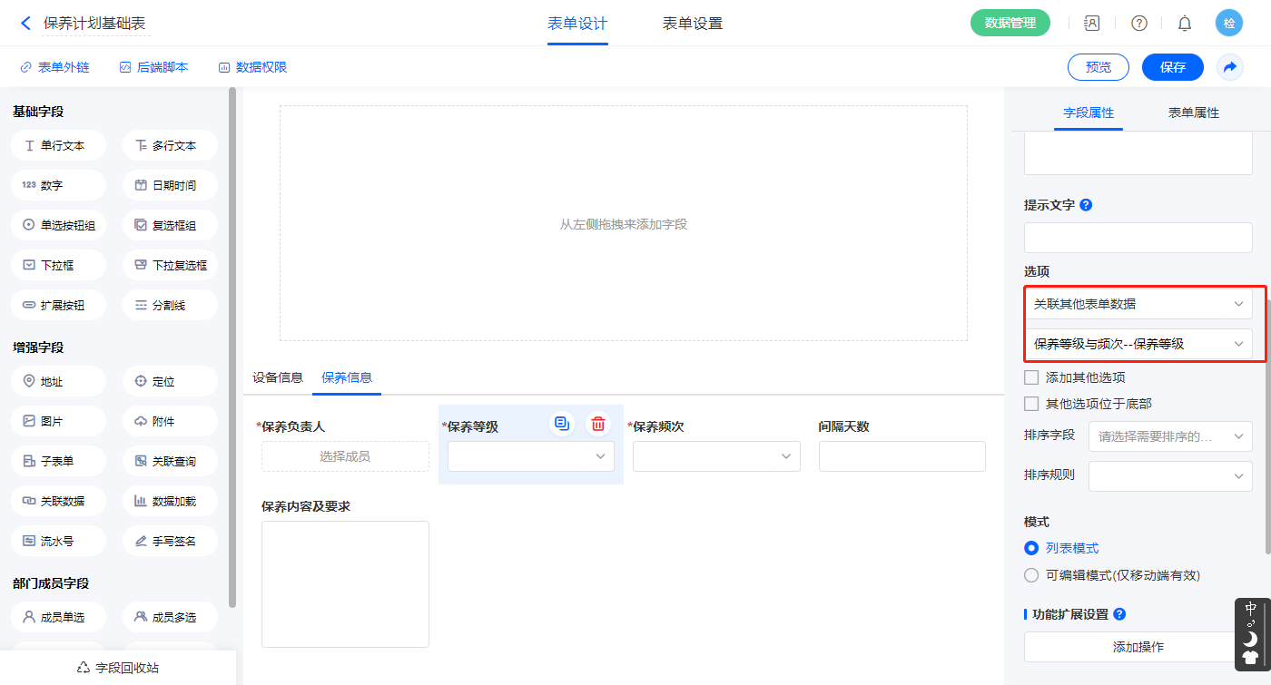 2)【保养等级】字段,选择设置为关联其他表单数据,关联保养等级与频次的【保养等级】字段;