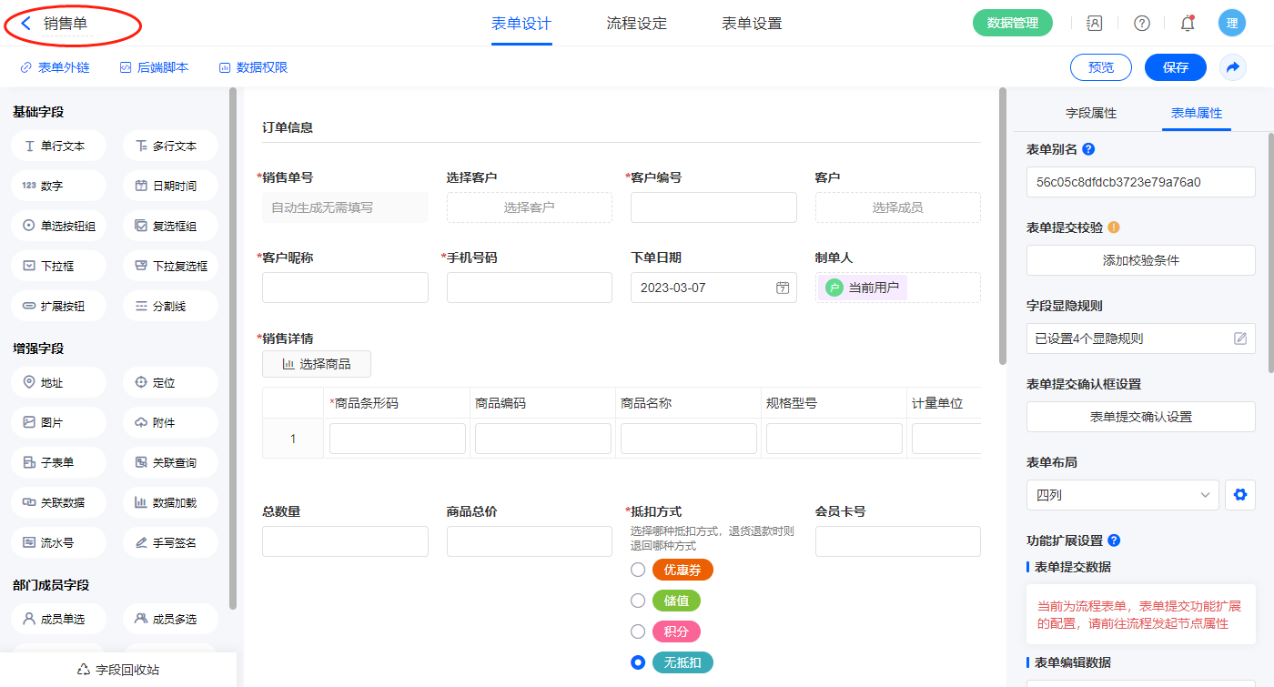 1)【销售单号】字段,选择设置为关联其他表单数据,关联销售单的【销售单号】字段;