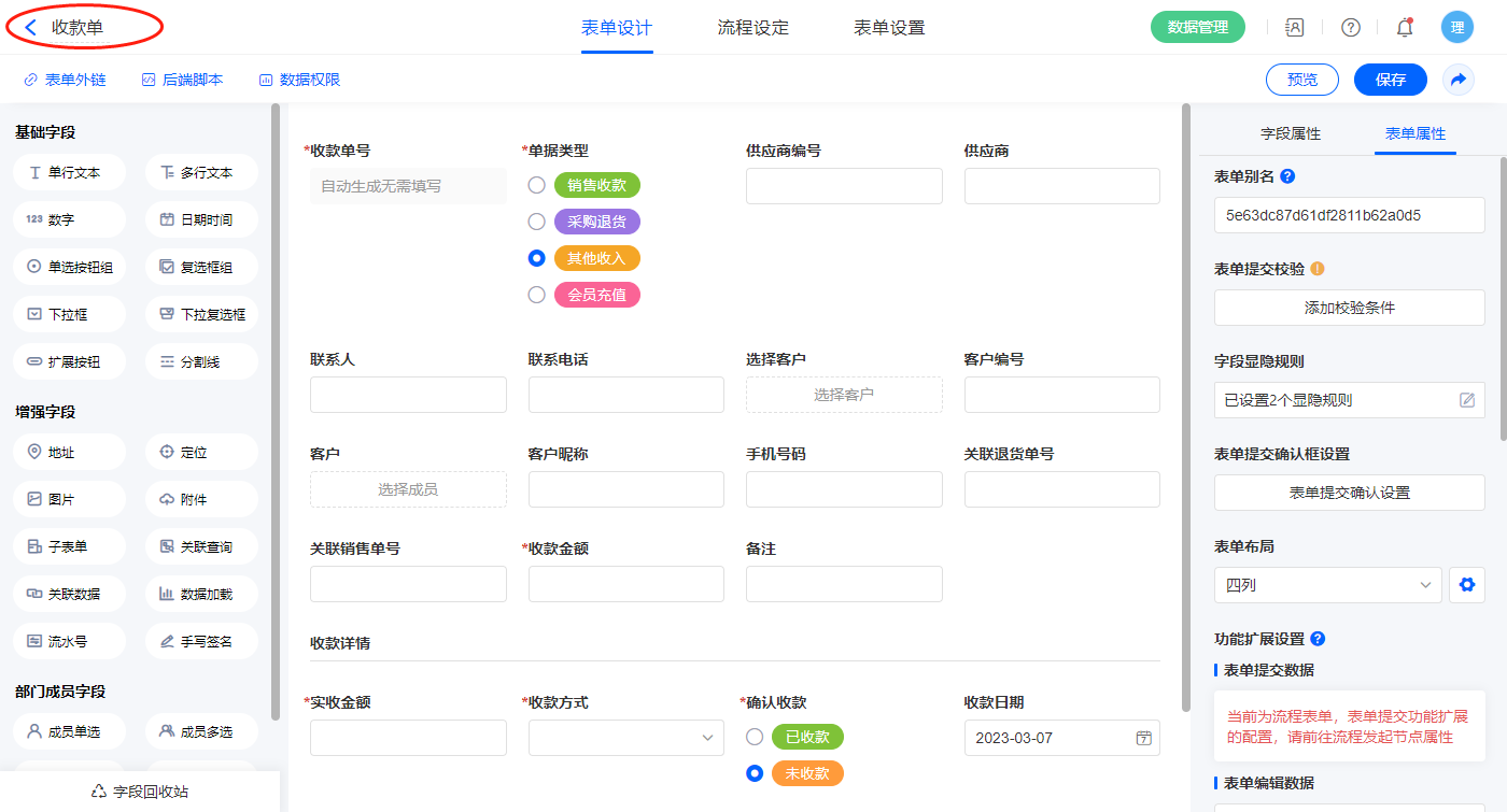 | 备注 | 单行文本 | 收款详情 | 分割线 |
