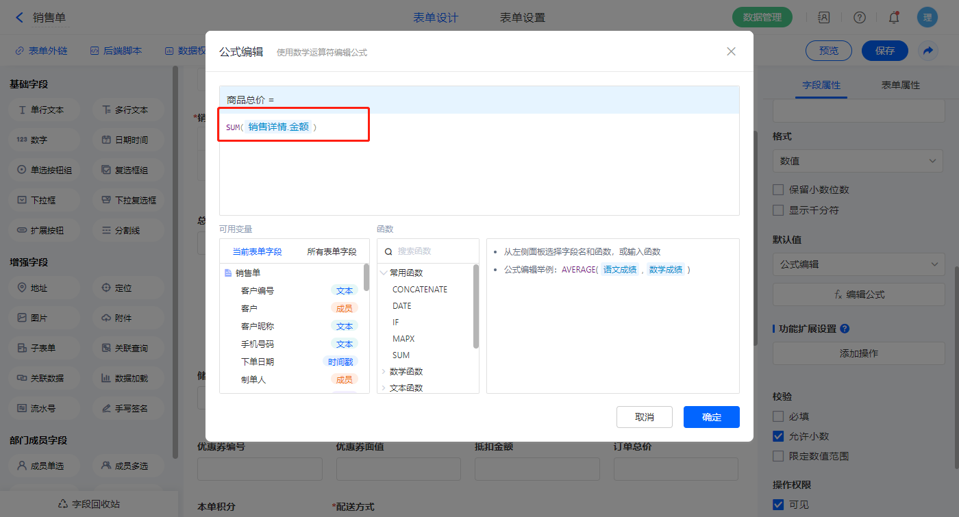 【订单总价】字段,设置默认值为公式编辑,如图设置公式;