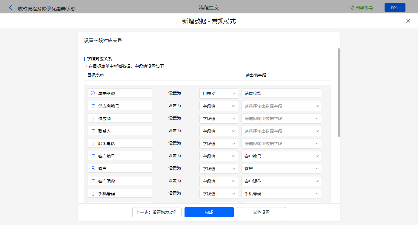 新增新增数据的执行动作,选择目标表单【收款单】,选择对应过滤条件,以及赋值字段;