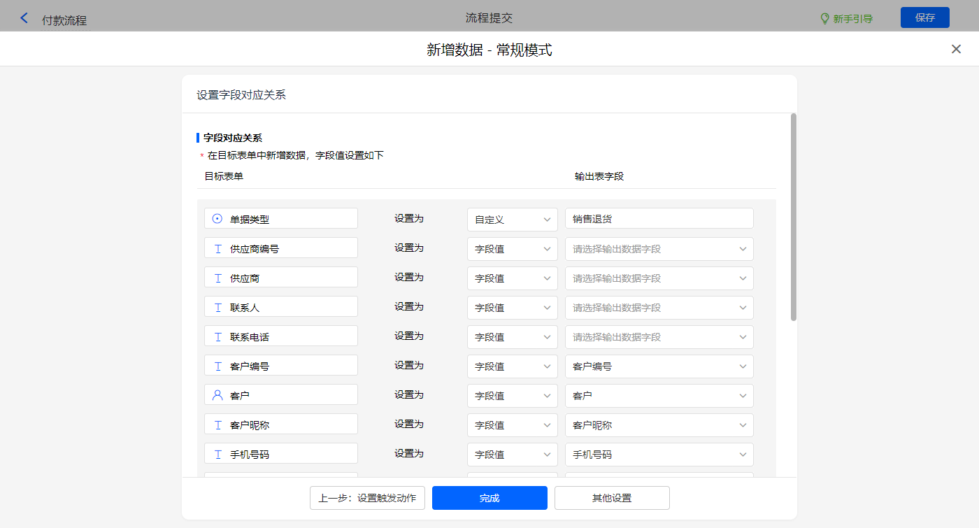 新增新增数据的执行动作,选择目标表单【付款单】表单,设置对应的赋值字段;