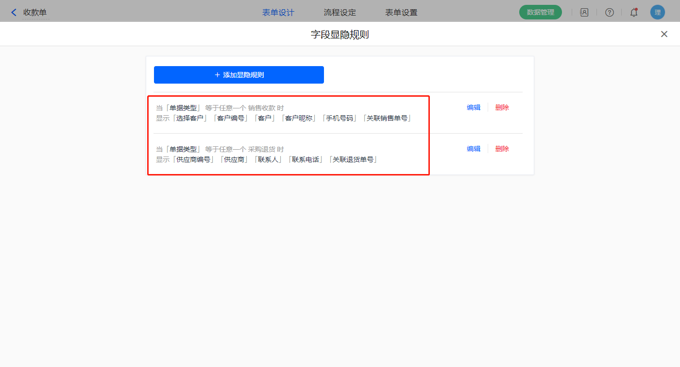 3)设置两条显隐规则,当【单据类型】字段等于销售收款显示【选择客户】、【客户编号】、【客户】、【客户昵称】、【手机号码】、【关联销售单号】字段,当【单据类型】字段等于采购退货显示【供应商编号】、【供应商】、【联系人】、【联系电话】、【关联退货单号】字段;