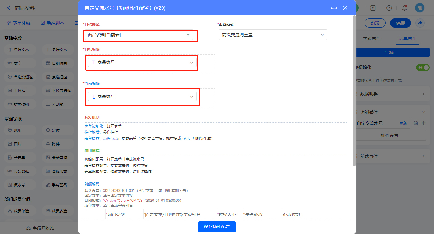 1)表单初始化设置一个功能插件,【自定义流水号】;