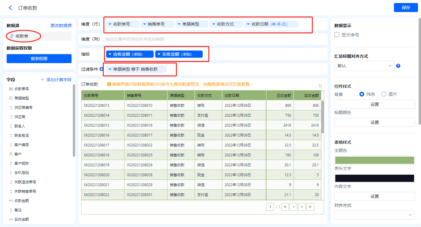 1)新增【销售订单结算】报表,用基础报表【透视图】展示数据源为表单【收款单】数据,添加过滤条件【单据类型】等于销售收款;