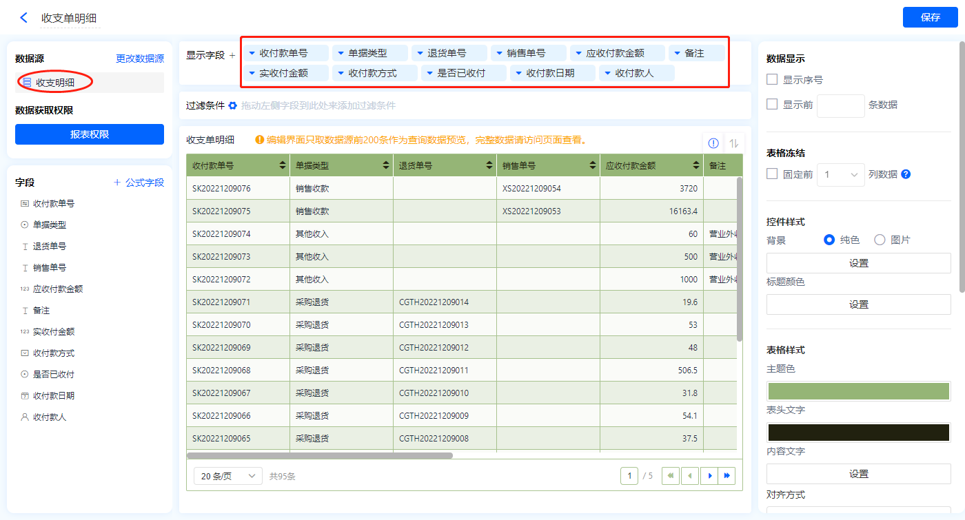 1)新增【收支明细】报表,用基础报表【数据表】展示数据源为视图【收支明细】的数据;