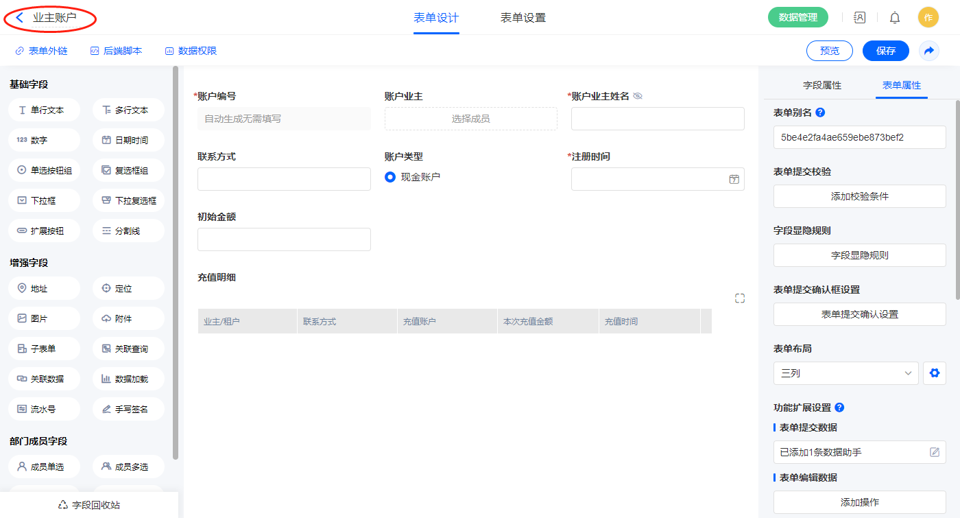 2)新增表单【业主账户】,字段设置如下;