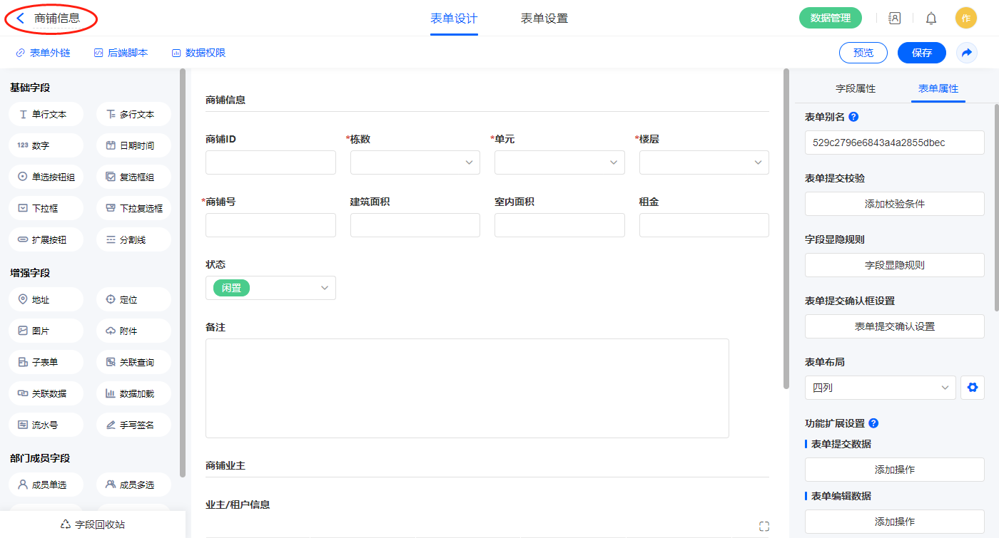 | 商铺号 | 单行文本 | 业主/租方姓名 | 单行文本 |