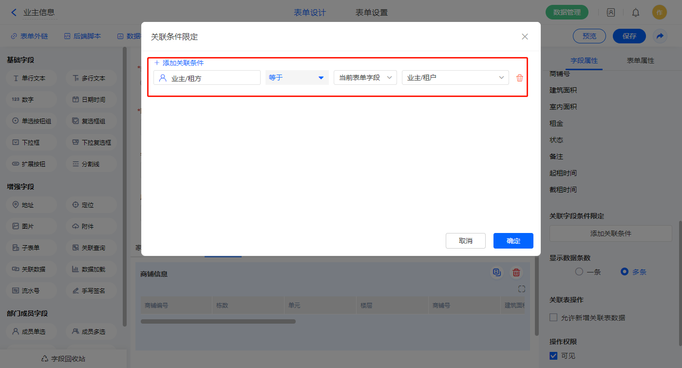【业主账户】关联查询字段,设置关联表为【商铺信息】并如图选择关联字段,设置显示数据条数为多条;