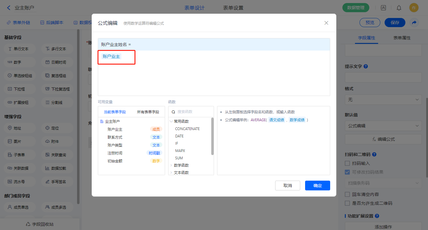 1)【账户业主姓名】字段,默认值选择公式编辑,如图设置公式并权限设置不可见;