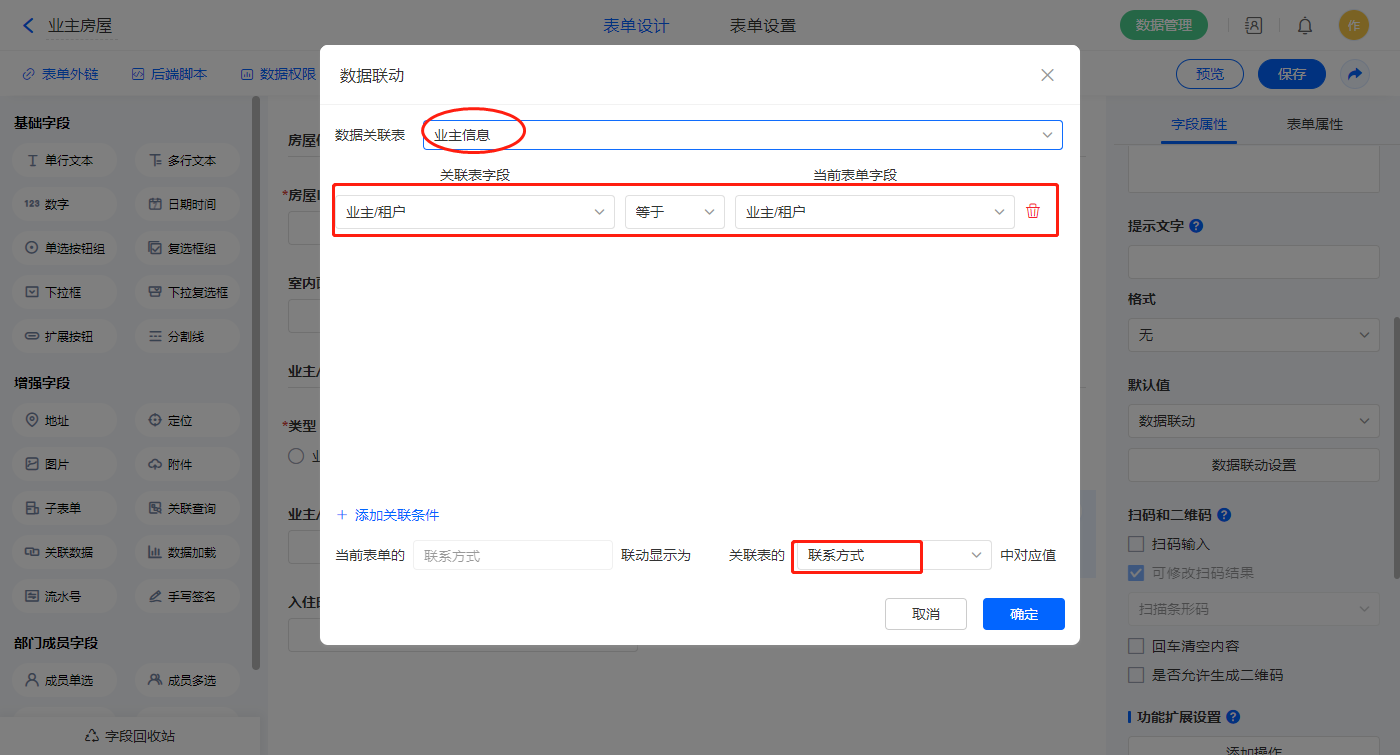 设置关联条件,【业主/租户】字段作为关联条件;