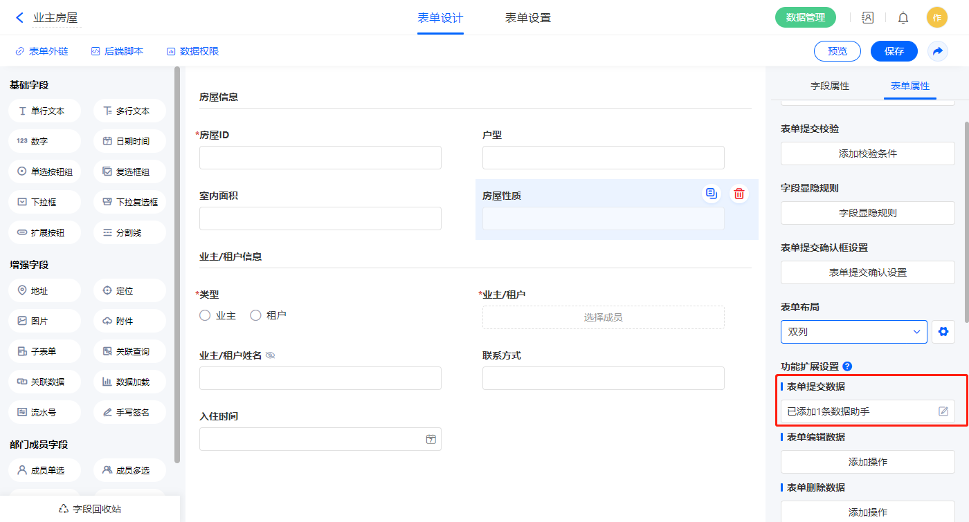 | 业主/租户 | 成员单选 | 房屋ID | 单行文本 |