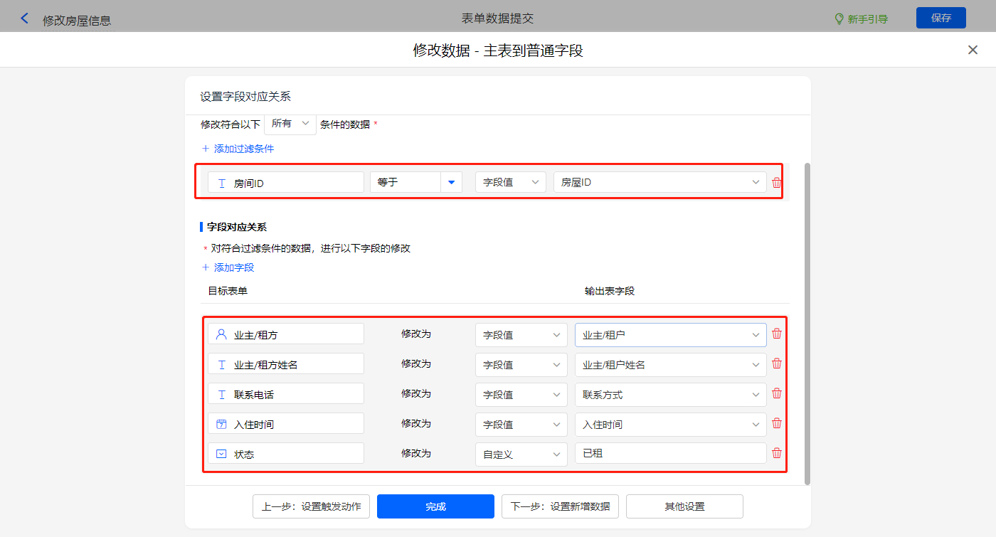 新增修改数据的执行动作,选择目标表单【业主信息】,配置过滤条件及对应赋值字段,设置好点击【完成】并保存该数据助手;