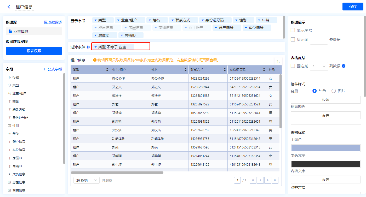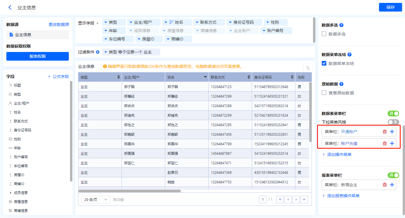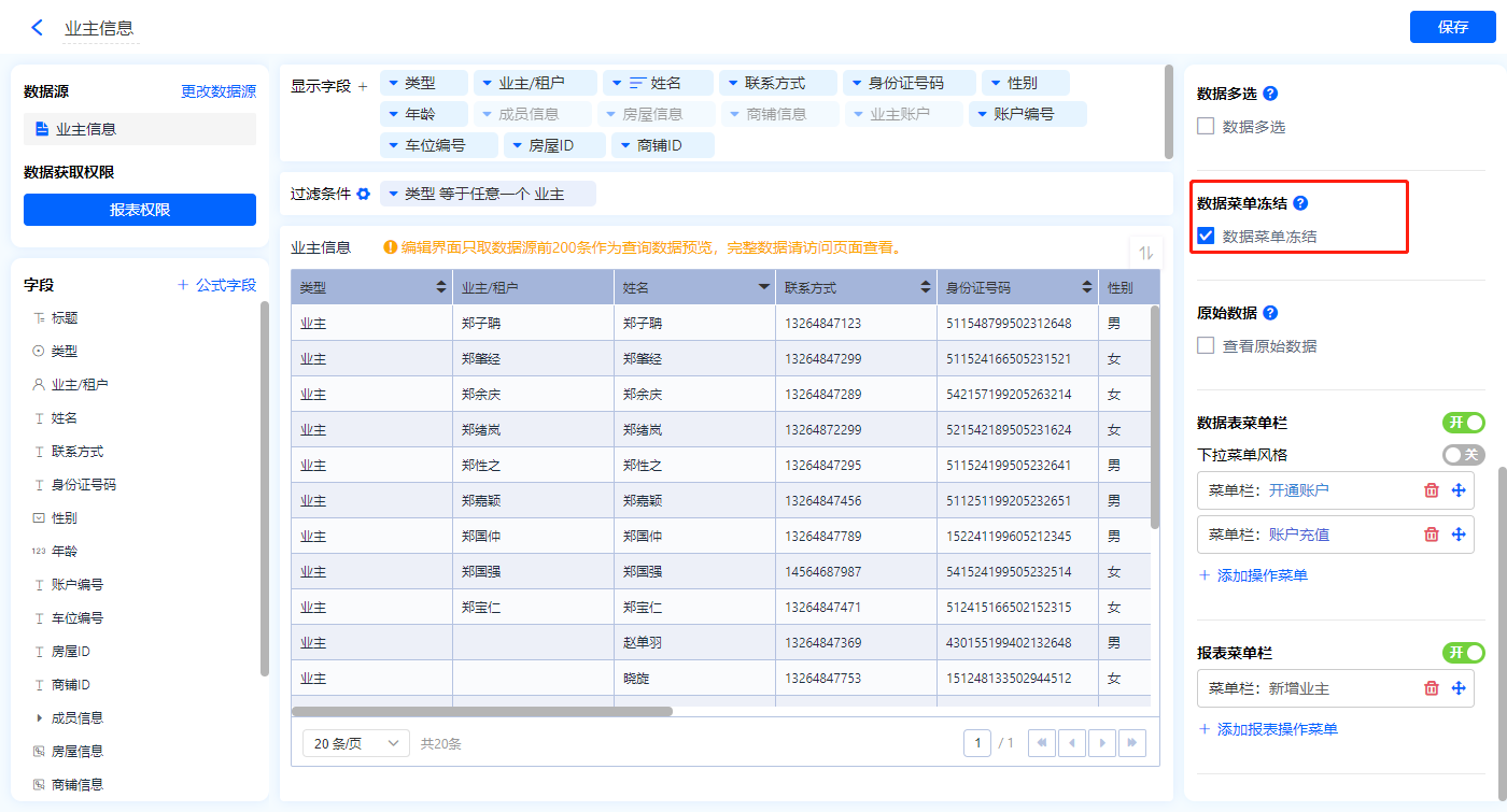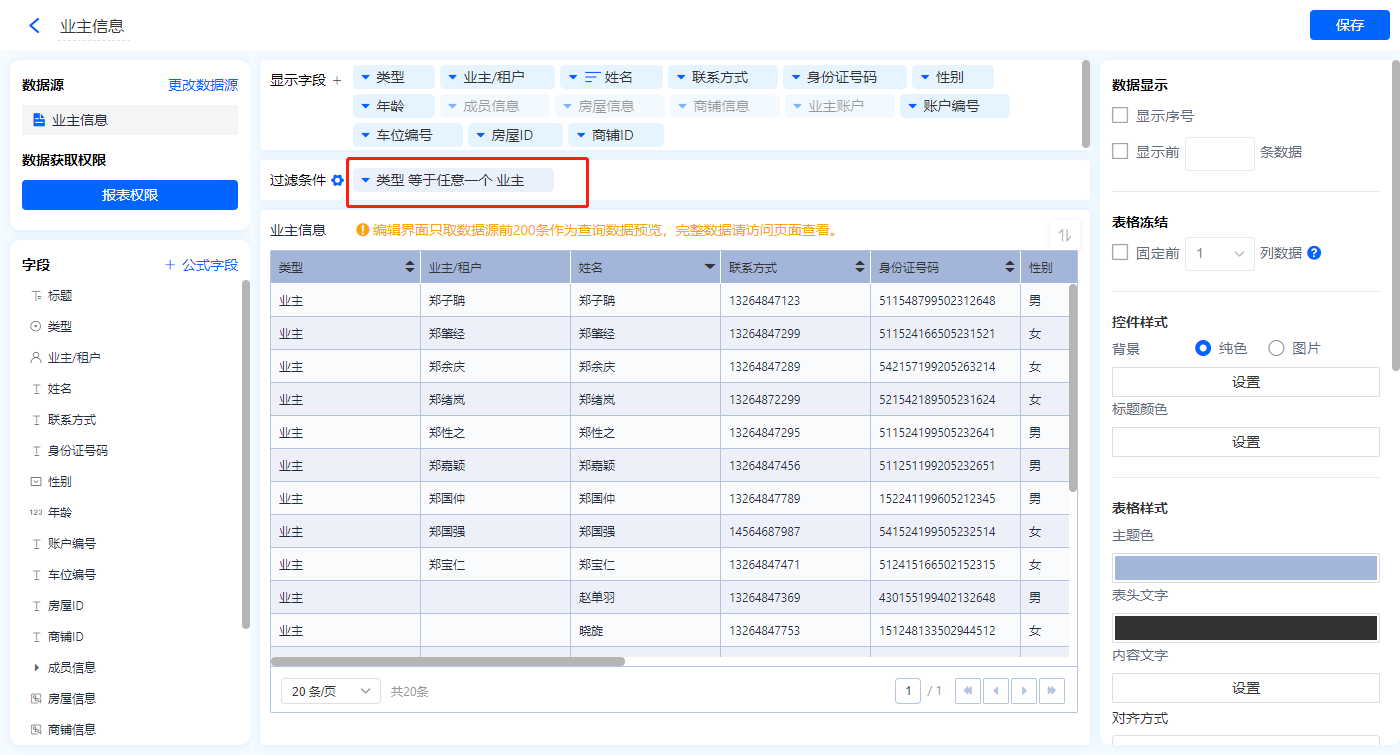 1)新增【业主管理】报表,用基础报表【数据表】展示数据源为表单【业主信息】的数据;