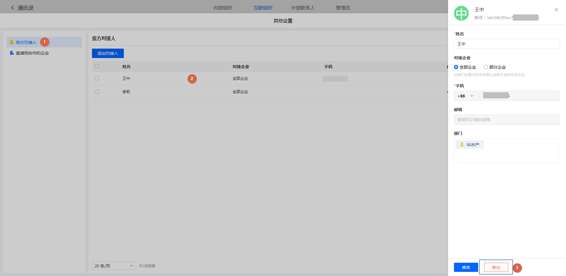 当对接人发生岗位或其他变动时,需要移除对接人。