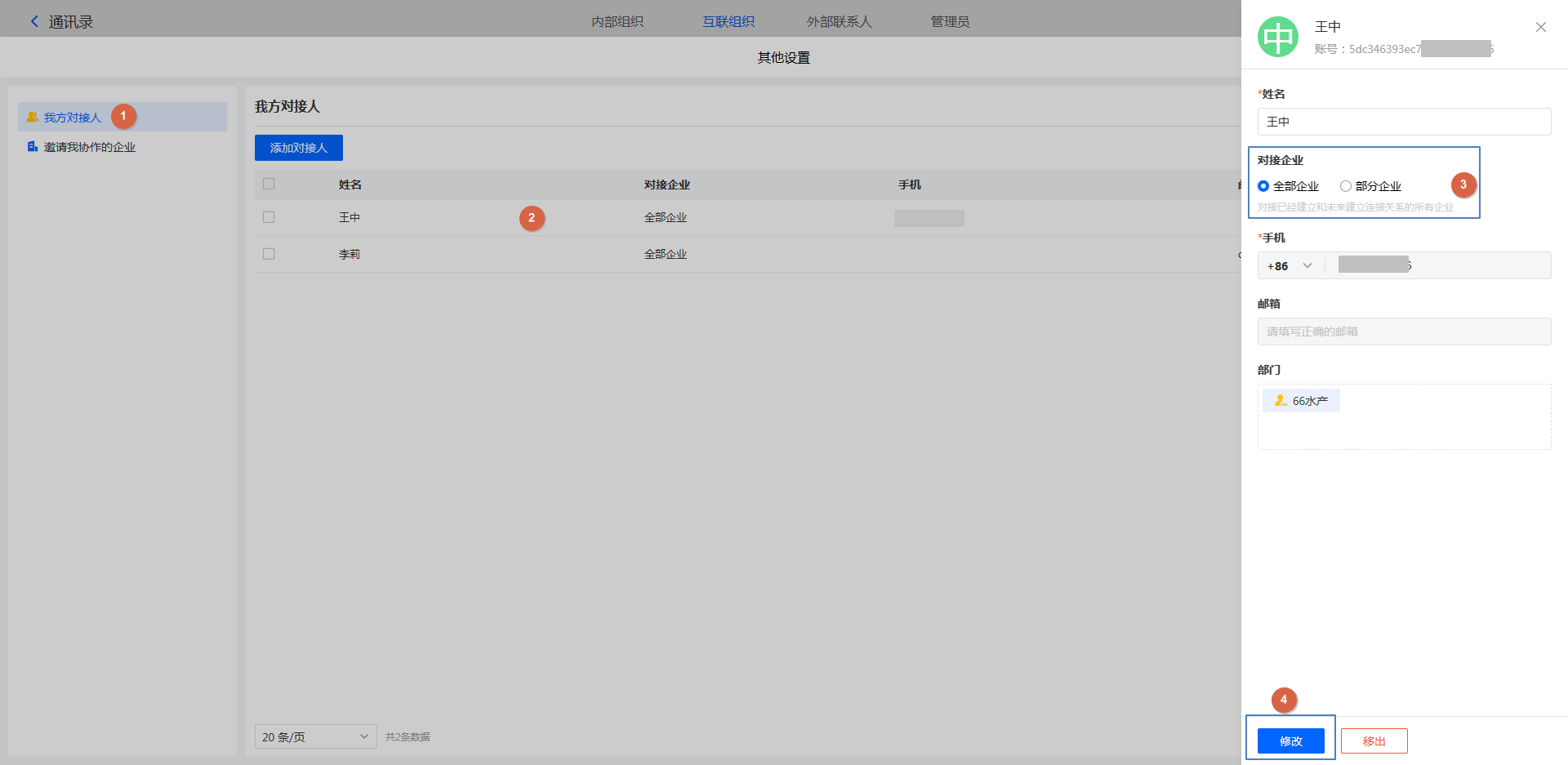 注意:只有内部成员可以设置为对接人,外部联系人不可设置为对接人;即外部联系人不参与企业互联的任何业务。
