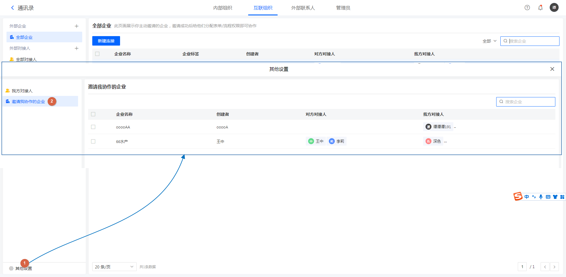 「邀请我协作的企业」中的企业,是对方通过邀请链接的方式连接到了我方平台账号。当我方系统管理员或创建者同意了该连接后,即会在我方企业「邀请我协作的企业」中出现对方企业。