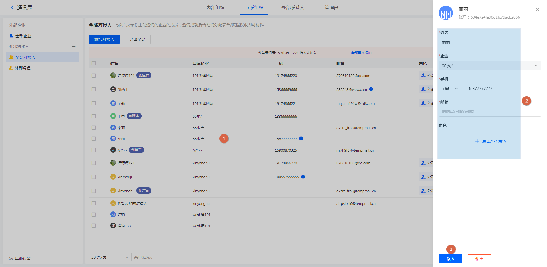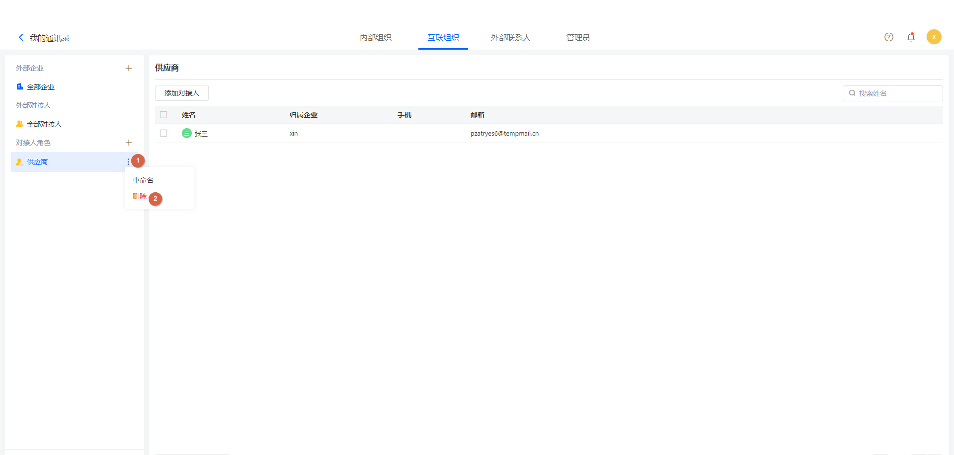 全部对接人列表中,显示了互联组织中的对方对接人。