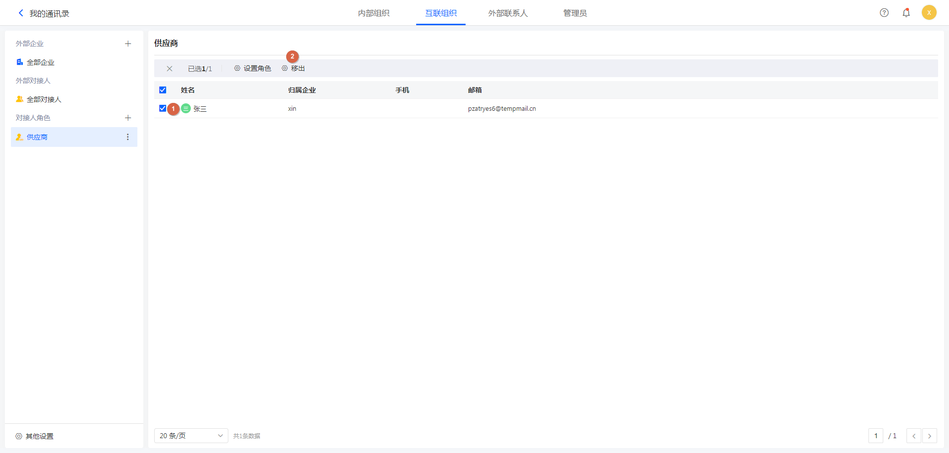 注:移出后,对接人无法再参与此角色相关的外部企业协作,但不会删除移出的对接人,可在全部对接人处继续设置角色。