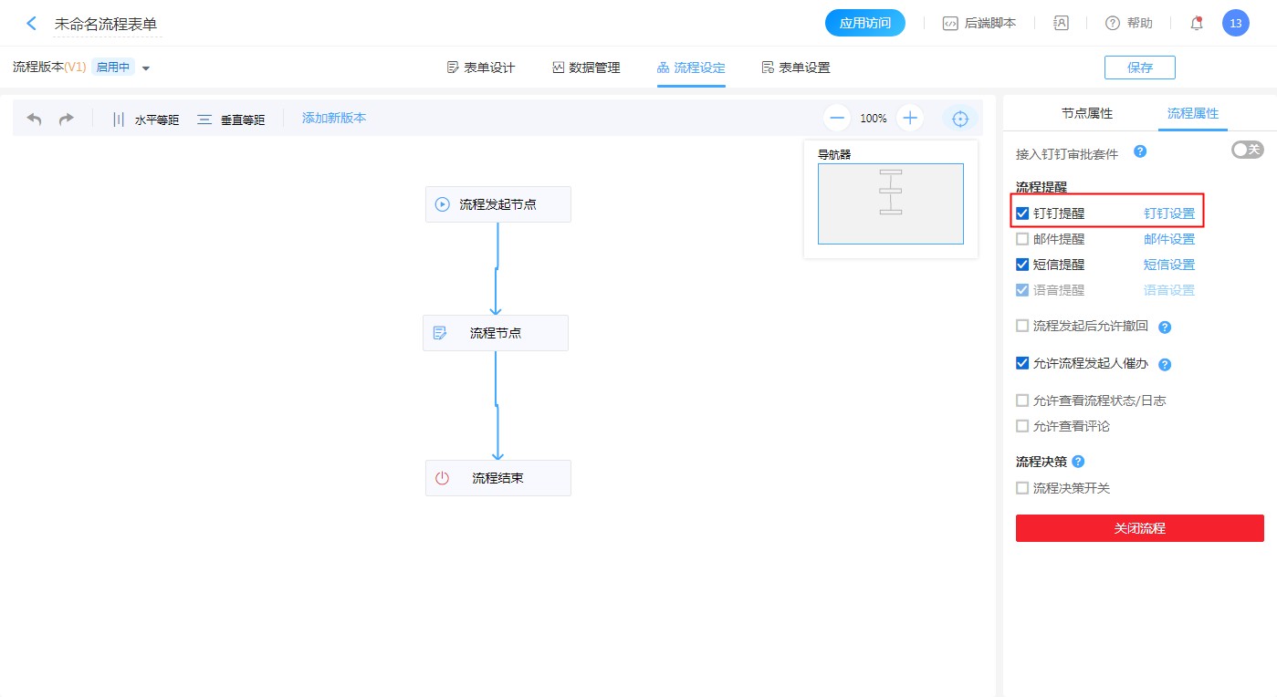 【流程设计】-【流程设定】-【流程属性】-【流程提醒】-【钉钉提醒,钉钉设置】