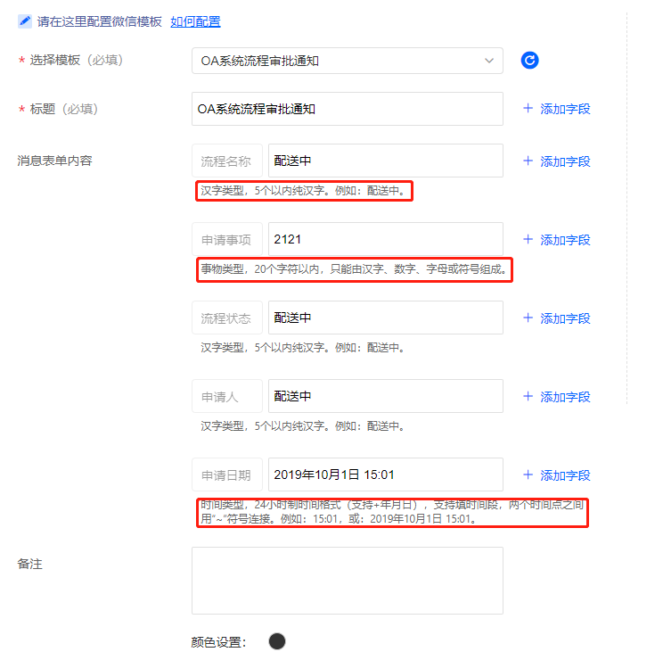 选择添加的模板,配置消息内容即可,模板消息中最终发送的内容需要符合微信字段类型格式的要求,对于不符合要求的内容,在发送时微信会进行拦截导致消息发送失败,发送失败微信消息可在企业管理->企业日志->消息日志里查看