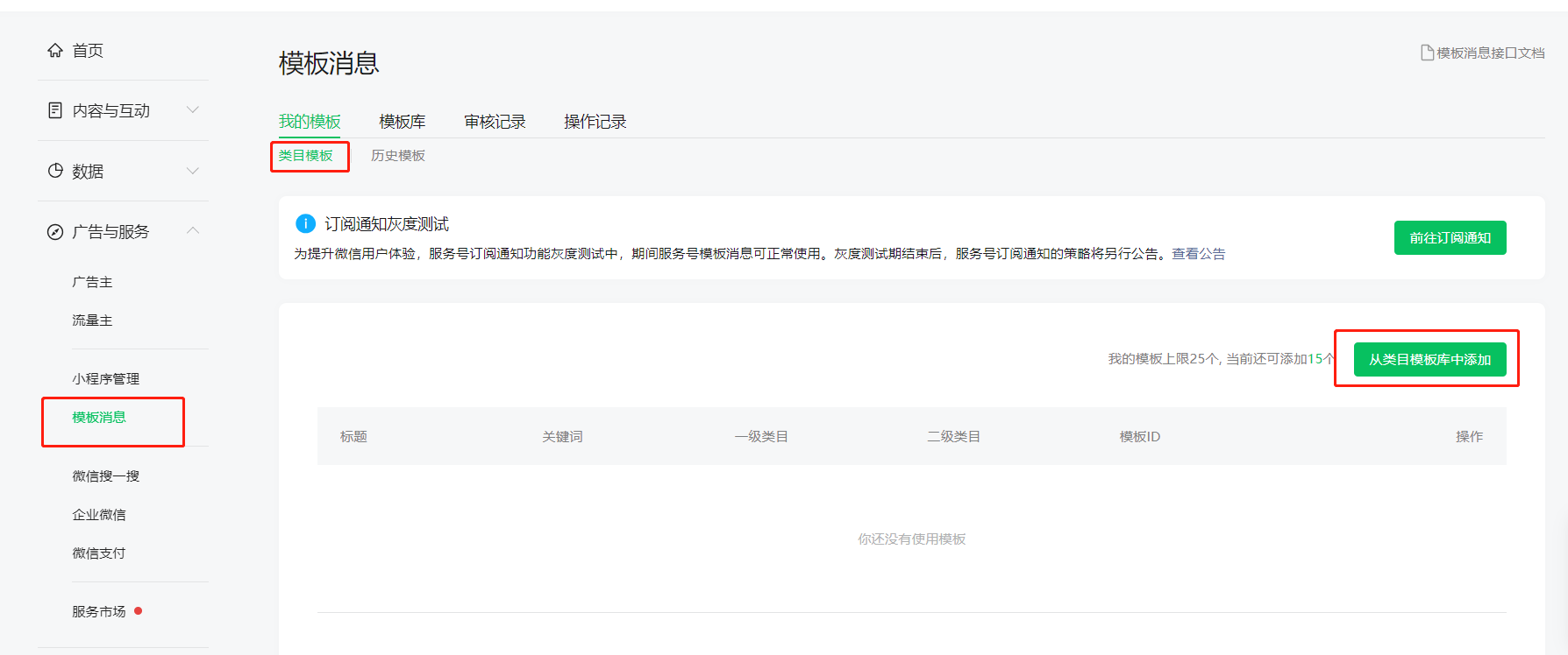 由于微信更改,不再支持添加新的消息模板,使用消息模板功能需要用类目模板,已经申请添加的历史模板可以继续使用.