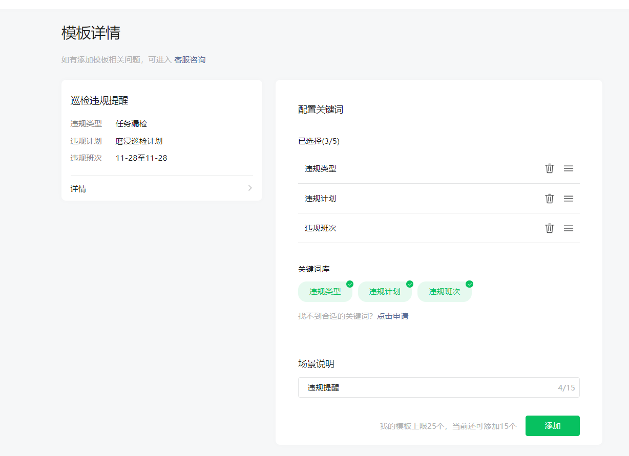 找到适合的模板,编辑消息模板字段后点添加即可完成消息模板的添加,消息模板添加成功后可在消息配置中配置使用