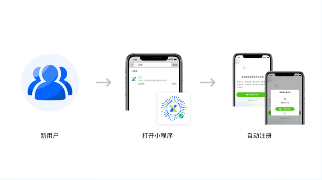 支持小程序使用,可以链接企业外部及上下游C类用户,一键无感注册登录,马上使用。