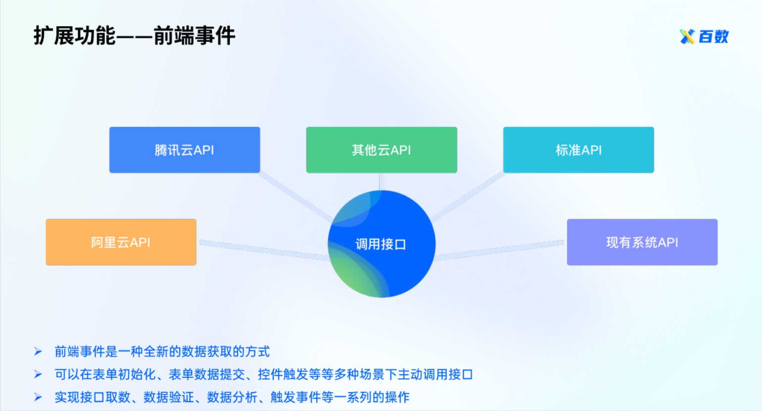- 前端事件:全新的数据获取的方式,可以在表单初始化、表单数据提交、控件触发等多种场景下主动调用接口。