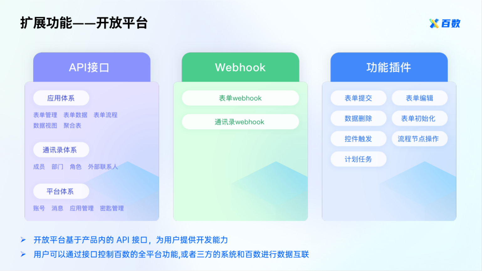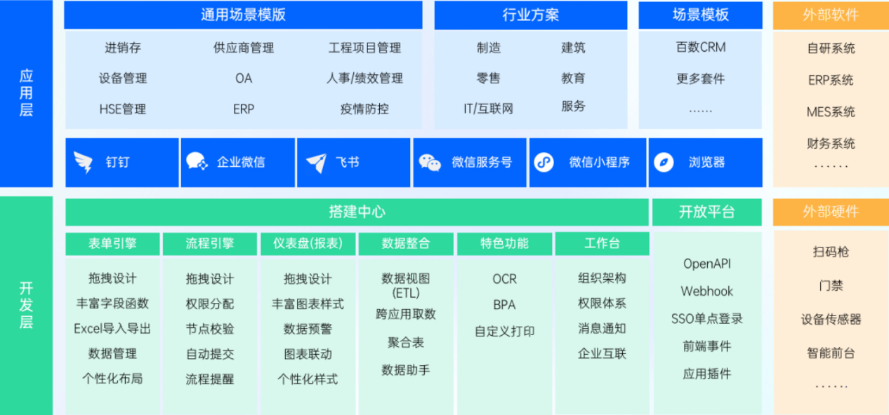 - 开放平台:基于产品内的API接口为用户提供开发能力,让用户可以通过自主开发或者使用官方第三方服务商等开发的功能来实现企业个性化需求。