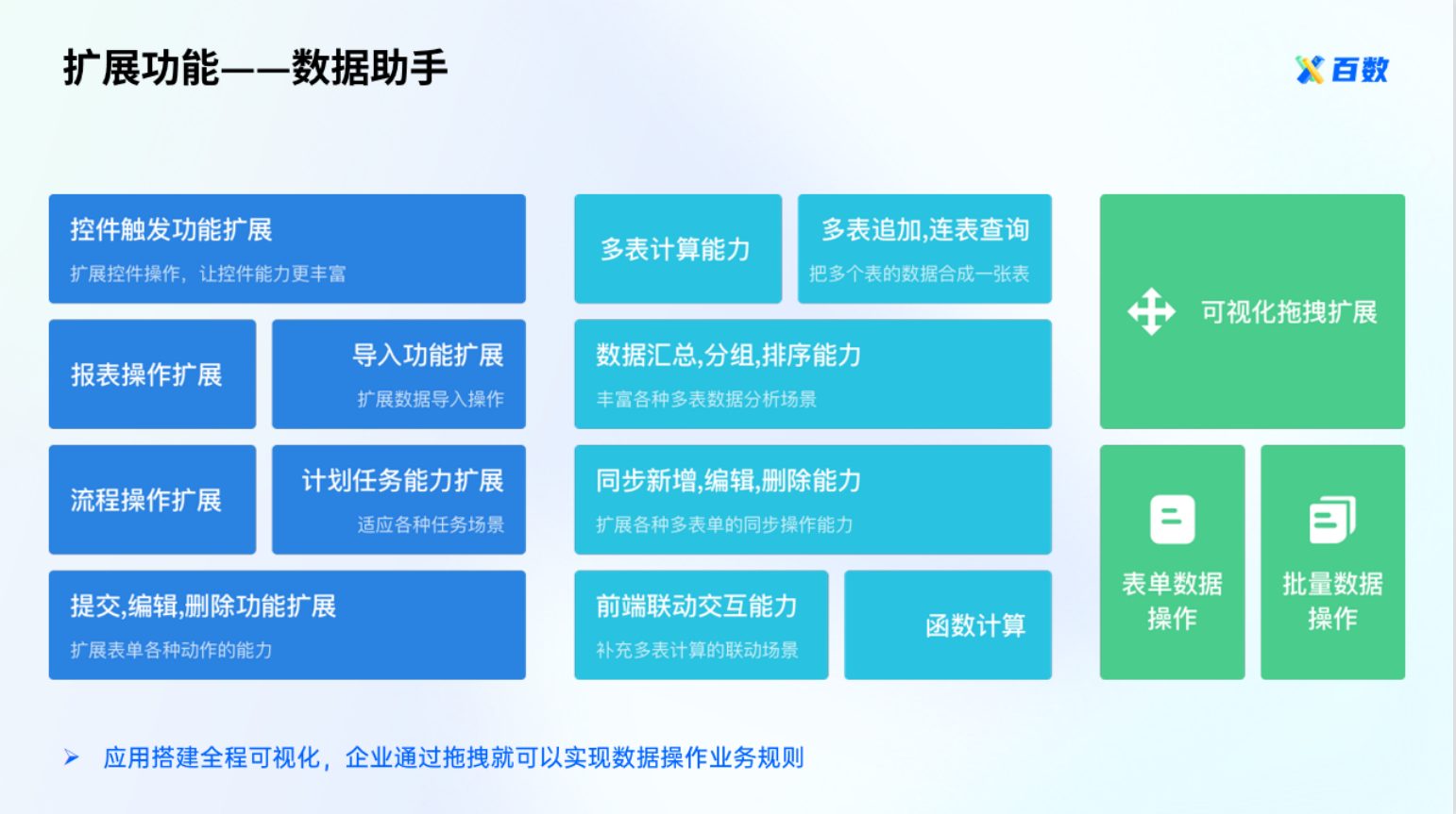 - 数据助手:应用搭建全程可视化,企业通过拖拽就可以完成常用的数据操作功能。