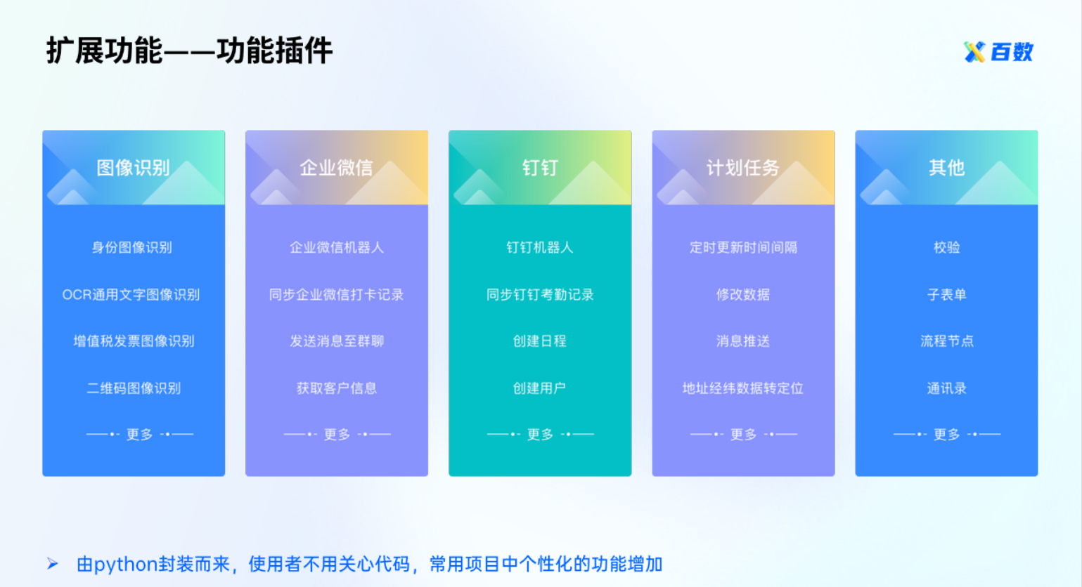 - 功能插件:由python封装而来,使用者不用关心代码常用项目中个性化的功能增加。