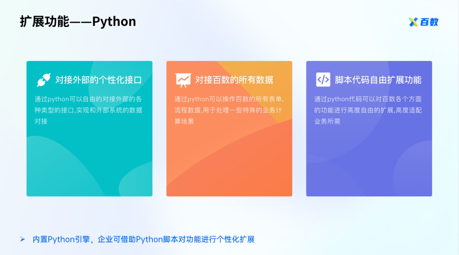 - Python:闪搭已覆盖目前市面上低代码产品的大多数功能,当用户对产品有特殊需求时可使用Python来实现。