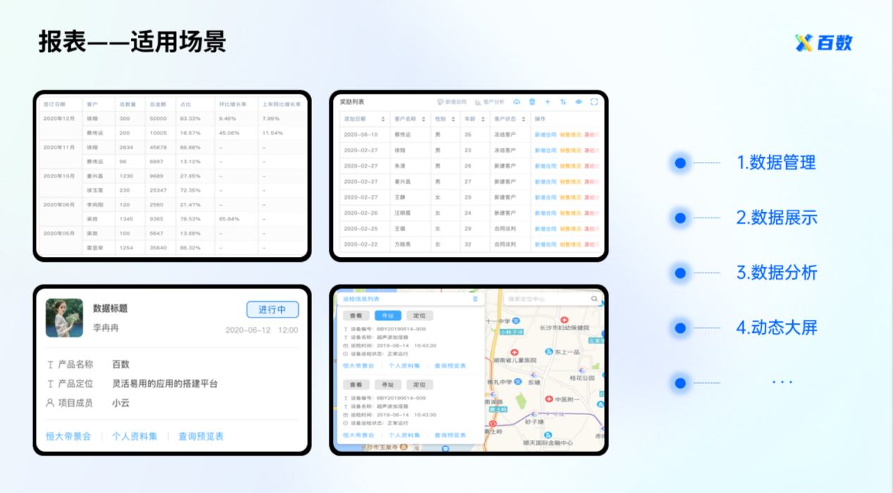 通过闪搭可以迅速搭建简单实用的CRM管理系统、进销存、生产管理、人事管理系统、财务系统,或者是调查问卷、报名登记申请等等应用场景。