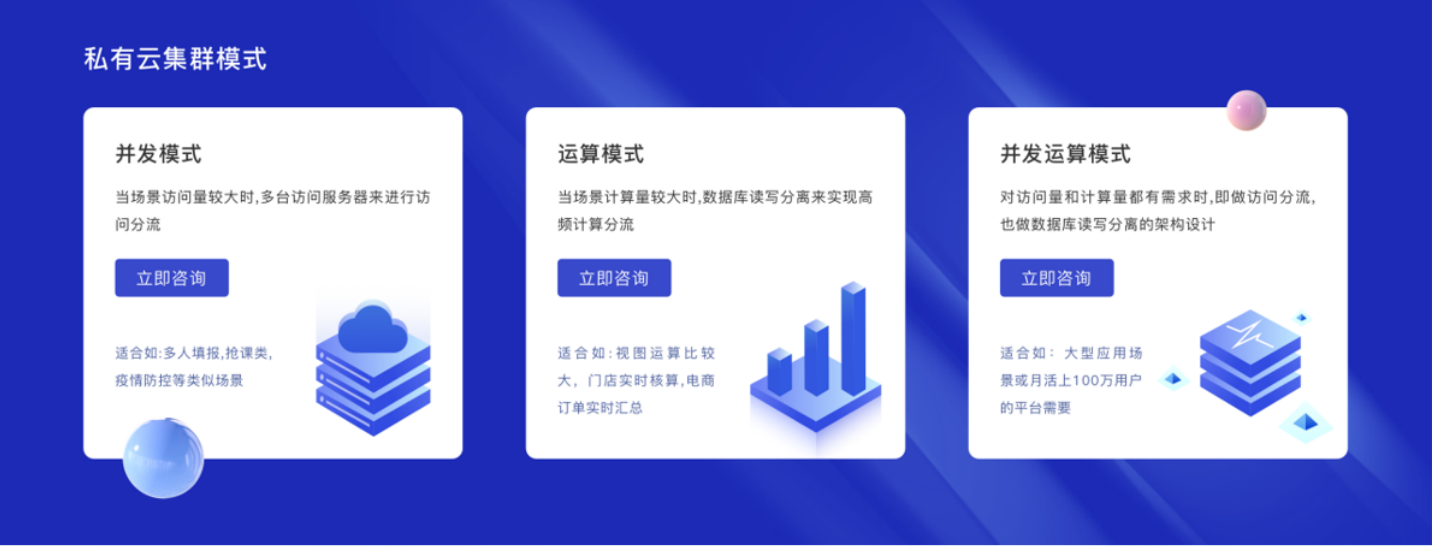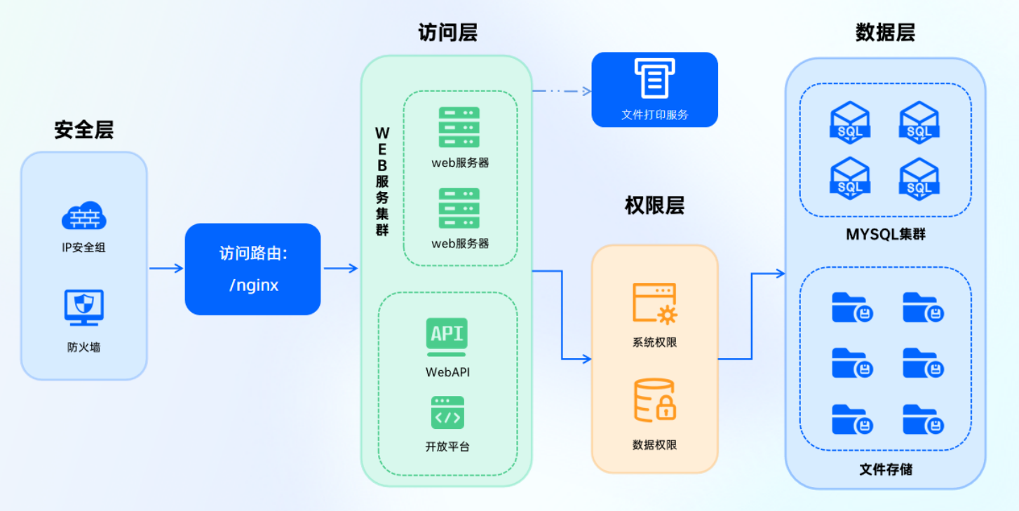 支持单点登录,可自定义域名、logo等;采用访问服务集群和mysql数据库集群,能有效保障数据的存储上限和数据处理的性能上限,可根据用户需求进行自由伸缩。 且适配阿里云/腾讯云/华为云/政务云/用户自建机房等多个搭建环境,落地更快,自由度更高。
