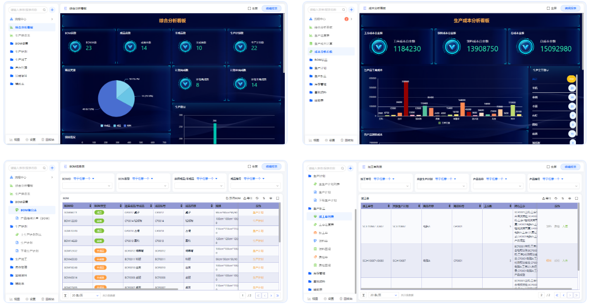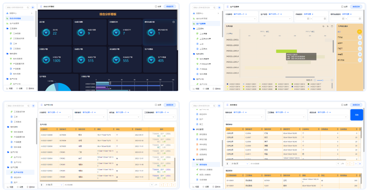 以制造管理为核心全流程管控工艺工序、制造物料、计划与生产、生产设备等,其管理功能包括工序、工艺路线、产品结构设置(BOM)、生产计划、投产报工、质检、库存等。