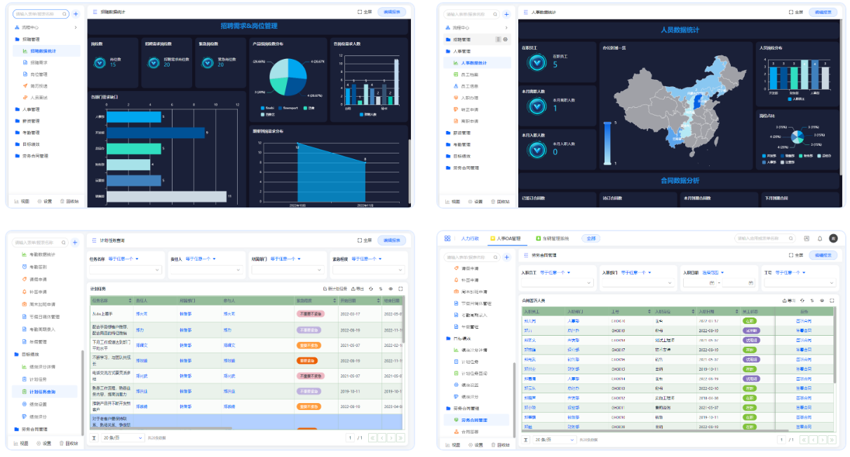 人事OA管理应用一站式解决人事问题的数字化难题。包括招聘管理、人事管理、薪资管理、考勤管理、目标绩效、劳务合同管理等模块。