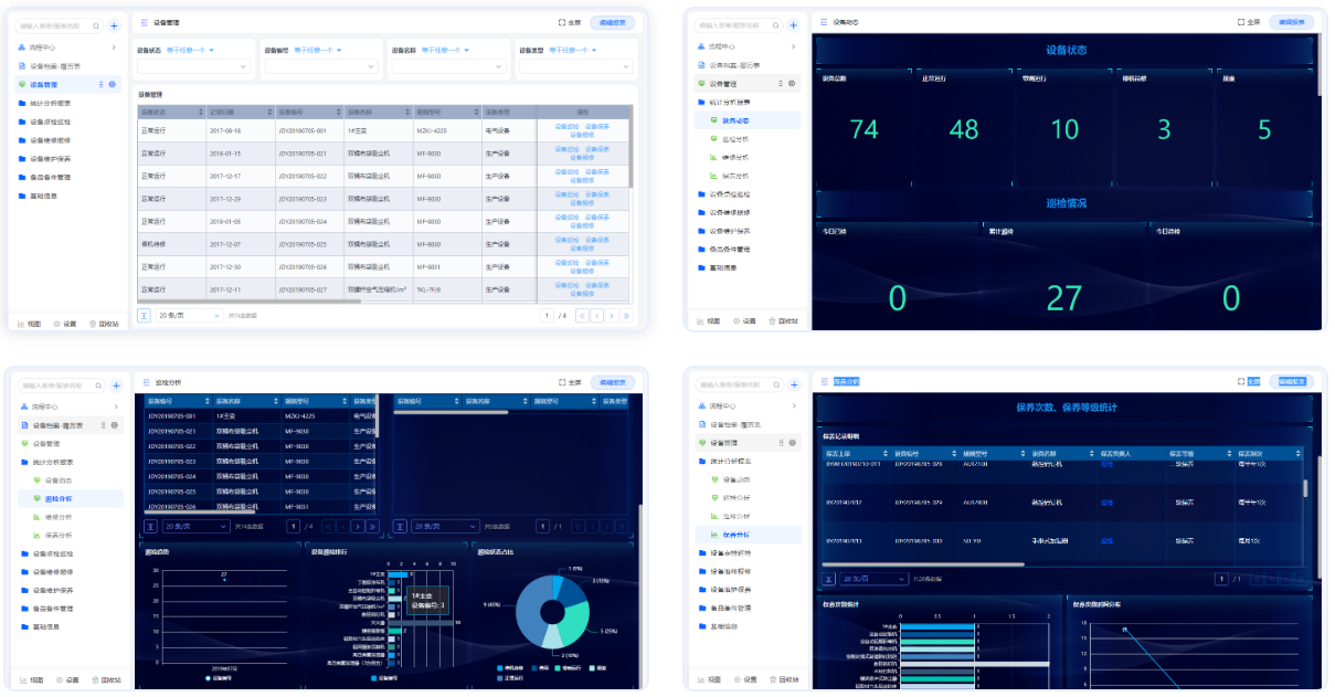 设备巡检管理系统主要功能是统计分析、设备管理、设备巡检、设备保养、备件更换,设备巡检及时掌握设备运行状况,发现设施缺陷和安全隐患,保证设备的安全。