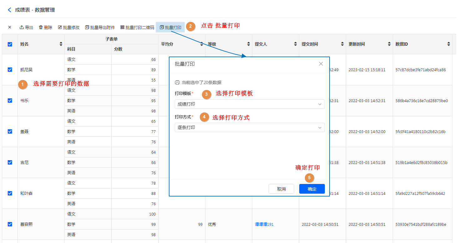 1、批量打印可以由管理员在【数据管理】处进行操作 ,选中需要打印的数据并打印