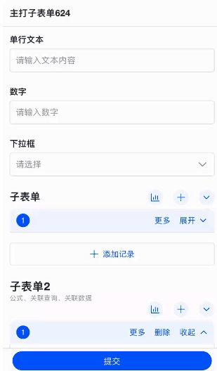 - 子表单移动端显示样式【纵向展开】,新建一行时,表单界面会自动定位到新建的行,并且把历史数据折叠起来。