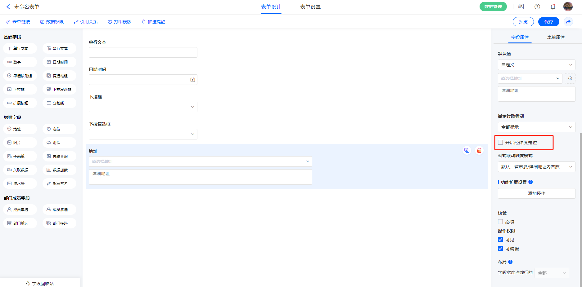 | 设置入口:表单设计-地址字段-【开启经纬度定位】 |