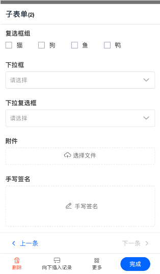 - 子表单支持复制到下一行,复选到最后一行,向上插入行,向下插入行。