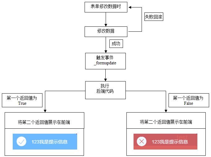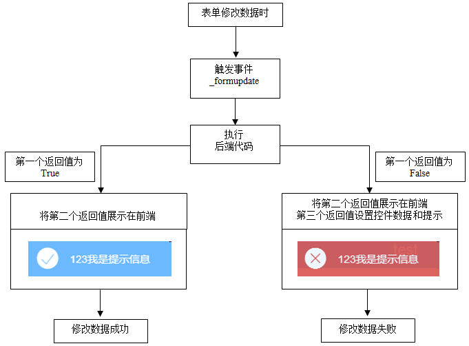 触发事件后,前端页面会将"当前表单别名","表单数据信息","数据提交类型"传给后端对应的云应用中的"_formupdate"函数,然后执行"后端代码"并返回"返回结果"和"需要界面展示的数据"。